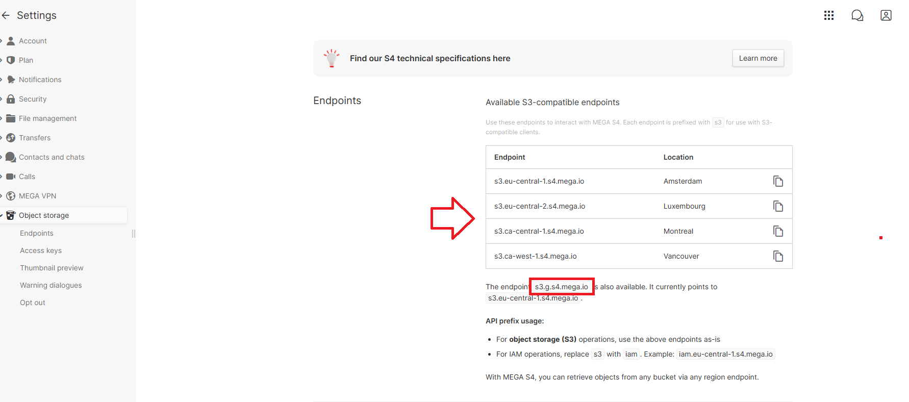 Si este punto final no funciona, puede probar otros puntos finales geográficos, que se pueden ver en la configuración de Almacenamiento de objetos: