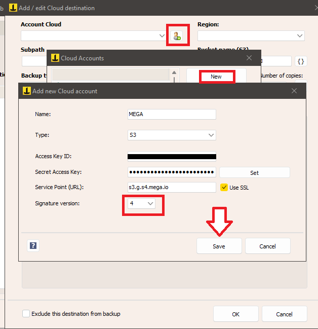 - Agregue una cuenta S3, ingresando sus credenciales MEGA: