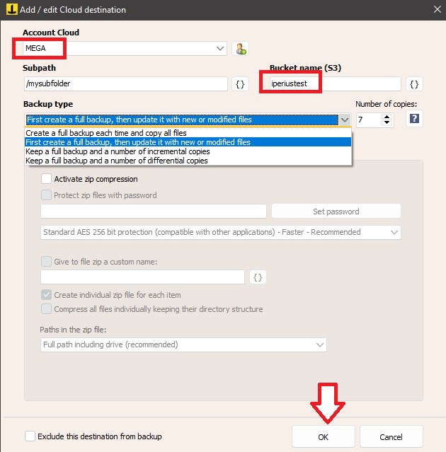 - Configure las opciones de copia de seguridad para guardar archivos en el destino de la nube de MEGA: