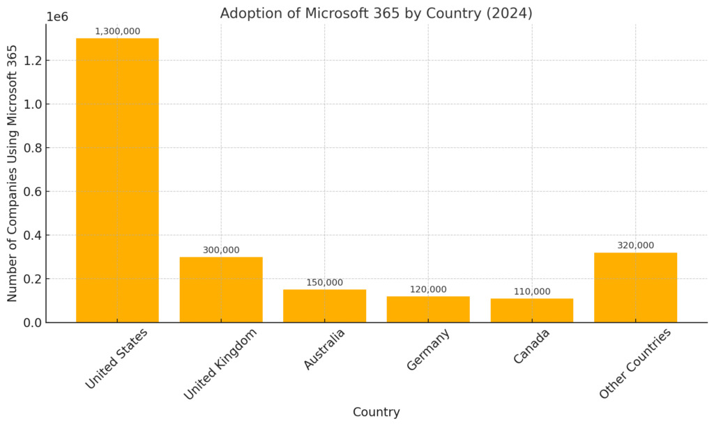 Figura: Adopción global de Microsoft 365: la participación de EE. UU. representa aproximadamente el 34 % del total de usuarios empresariales (más de 1,3 millones de más de 2 millones a nivel mundial)