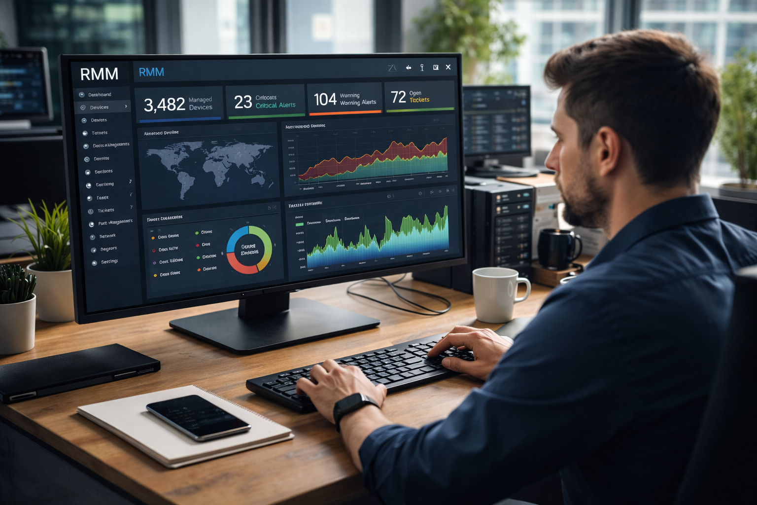 Las herramientas de Monitoreo y Gestión Remota (RMM) son software especializado que permite a los MSP (Proveedores de Servicios Gestionados) y a los departamentos de TI supervisar remotamente los servidores y estaciones de trabajo de los clientes. Un buen RMM permite automatizar la monitorización de hardware y software, gestionar las actualizaciones del sistema, aplicar parches de seguridad, realizar copias de seguridad y proporcionar acceso remoto seguro , todo desde una única consola centralizada. Además de simplificar el mantenimiento diario, un RMM ayuda a prevenir problemas y a responder rápidamente en caso de fallos, mejorando así la eficiencia del servicio de TI.